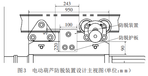 (2)防坠落装置结构设计。原CD1-1-18电动葫芦总长2 100 mm,总宽8 50 mm,总高1 200 mm,大梁截面尺寸140 mm×80 mm,行走电机槽宽度100 mm;并经过测量,原有的大梁与行走电机槽中心部分最小间距为243 mm,连接板板长950 mm,板宽90 mm,板厚 13 mm,可以设计并安装 2 个尺寸为 220 mm×100 mm×40 mm 的防脱护板结构(槽钢),通过高强度钢连接杆形成刚性稳固的支撑框架防脱装置,分散承重应力,防止因金属疲劳导致局部断裂。槽钢与主体结构采用螺栓配合缓冲垫片联接,避免摩擦损耗,延长使用寿命;为便于定期检查与更换槽钢,连接杆采用快拆式结构。