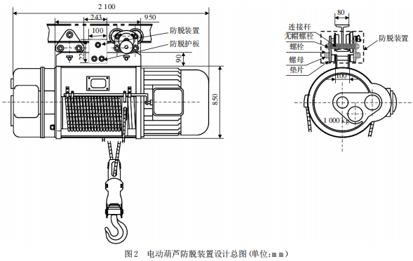 (2)防坠落装置结构设计。原CD1-1-18电动葫芦总长2 100 mm,总宽8 50 mm,总高1 200 mm,大梁截面尺寸140 mm×80 mm,行走电机槽宽度100 mm;并经过测量,原有的大梁与行走电机槽中心部分最小间距为243 mm,连接板板长950 mm,板宽90 mm,板厚 13 mm,可以设计并安装 2 个尺寸为 220 mm×100 mm×40 mm 的防脱护板结构(槽钢),通过高强度钢连接杆形成刚性稳固的支撑框架防脱装置,分散承重应力,防止因金属疲劳导致局部断裂。槽钢与主体结构采用螺栓配合缓冲垫片联接,避免摩擦损耗,延长使用寿命;为便于定期检查与更换槽钢,连接杆采用快拆式结构。