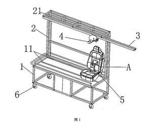请参阅图1和图2所示,本实施例是由长方体架体1、导轨支架2、导轨3、手动葫芦4和吊具5构成,长方体架体1的四个底角安装有脚轮6,长方体架体1上具有滑轨11,长方体架体1的一个侧边向上延伸导轨支架2,导轨支架2的顶端向长方体架体1的方向延伸有导轨挂架21,导轨3设置在导轨挂架21的底部,导轨3从导轨挂架21上延伸出一段,手动葫芦4滑动设置在导轨3上,手动葫芦4的吊钩挂有吊具5;如图3所示,吊具5是由靠背托51、底座52、插板53和吊环54构成,靠背托51设置在底座52上并朝向一侧,插板53设置在底座52上并向靠背托51的方向延伸,底座52上具有吊环54,使用时,将吊具5放置在汽车座椅A上,插板53向后插入在座椅靠背与椅座之间的缝隙中,靠背托51靠在椅背上。